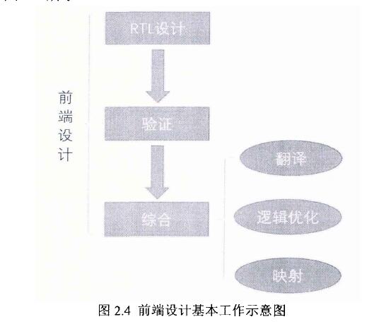 前端設(shè)計(jì)(front-end) 一般是指芯片從RTL設(shè)計(jì)到生成可以布局布線的門級(jí)網(wǎng)表(Netist) 的階段,按照工作內(nèi)容進(jìn)行劃分,主要包括設(shè)計(jì)、驗(yàn)證和綜合三大部分,如圖2.4所示。