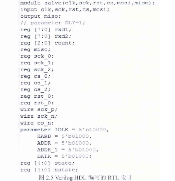 數(shù)字前端設(shè)計(jì)需要借助特定的EDA工具。早期的硬件IC系統(tǒng)通常采用原理圖輸入的方法進(jìn)行設(shè)計(jì),雖然這種方法直觀、可控性好,并且效率也較高,但設(shè)計(jì)復(fù)雜,可移植性差,在大規(guī)模設(shè)計(jì)時(shí)耗時(shí)耗力。隨著芯片邏輯規(guī)模的不斷攀升和計(jì)算機(jī)技術(shù)的發(fā)展,這種落后的設(shè)計(jì)方式越來(lái)越顯得力不從心,取而代之的是計(jì)算機(jī)代碼輸入的方式,即硬件描述語(yǔ)言HDL (Hardware Description Language)逐漸成為主流設(shè)計(jì)硬件IC系統(tǒng)的方法。 本文RTL設(shè)計(jì)采用的就是Verilog HDL語(yǔ)言,如圖2.5所示,為SPI接口協(xié)議的部分Verilog 硬件描述語(yǔ)言。
