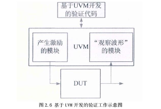 目前芯片的驗(yàn)證環(huán)境主要為UVM,全稱為通用驗(yàn)證方法論,其前身是OVM.UVM是通用的驗(yàn)證平臺(tái),基于它能夠產(chǎn)生大量、復(fù)雜且可定制化的隨機(jī)激勵(lì),可顯著提高大型驗(yàn)證工程的擴(kuò)展性和協(xié)作性。舉例說(shuō)明,UVM框架如軟件開(kāi)發(fā)過(guò)程中的分層結(jié)構(gòu),只要定義好統(tǒng)一的接口,工程中的各個(gè)層次就可以分配給不同的研發(fā)團(tuán)隊(duì)進(jìn)行開(kāi)發(fā)。驗(yàn)證的項(xiàng)目同樣如此,即使產(chǎn)生激勵(lì)的工程有改動(dòng),也不會(huì)影響到“觀察波形”的團(tuán)隊(duì)。而UVM在驗(yàn)證工作中如同一個(gè)管家,可以將“輸入激勵(lì)”和“觀察波形”的過(guò)程統(tǒng)一管理了起來(lái)。如圖2.6所示,為基于UVM開(kāi)發(fā)的驗(yàn)證示意圖,其中DUT為待驗(yàn)證模塊,產(chǎn)生激勵(lì)模塊即編寫的TestBench。 激勵(lì)信號(hào)傳入DUT中,輸出需要觀察的波形或者結(jié)果,通過(guò)與預(yù)期的結(jié)果比較的過(guò)程,來(lái)判斷編寫的RTL代碼是否正確。