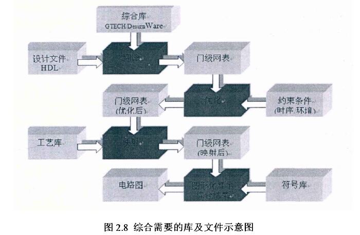 綜合一般由三部分組成, 分別是翻譯(Translate). 邏輯優(yōu)化(Optimizing)和映射(mapping)。 如圖2.7所示,為綜合過(guò)程的示意圖。如圖2.8所示,為綜合需要用到的庫(kù)及文件。