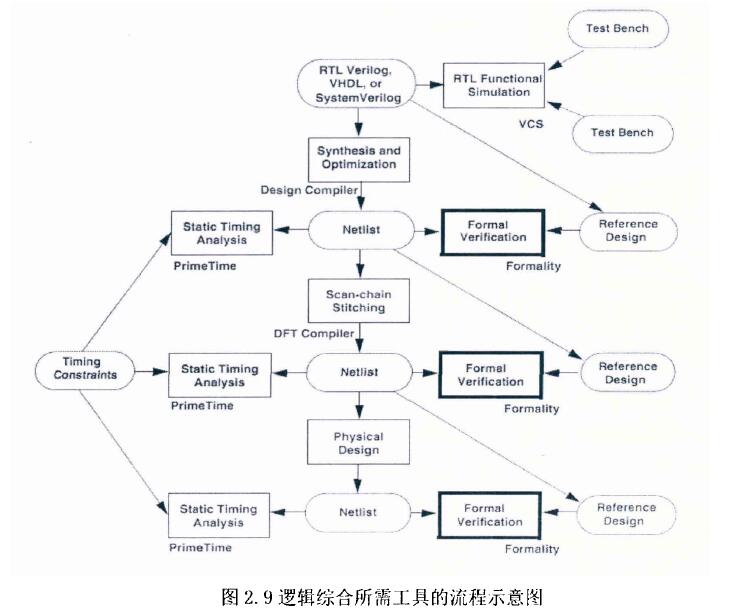 為此,綜合過(guò)程需要多種工具來(lái)保障對(duì)時(shí)序的要求。比如可測(cè)試性設(shè)計(jì)(DFT)、形式驗(yàn)證(Formal Verification)、靜態(tài)時(shí)序分析( Static Timing Analysis,STA)、功能仿真( Functional Simulation)等。如圖2.9所示,為綜合所需工具的流程示意圖。