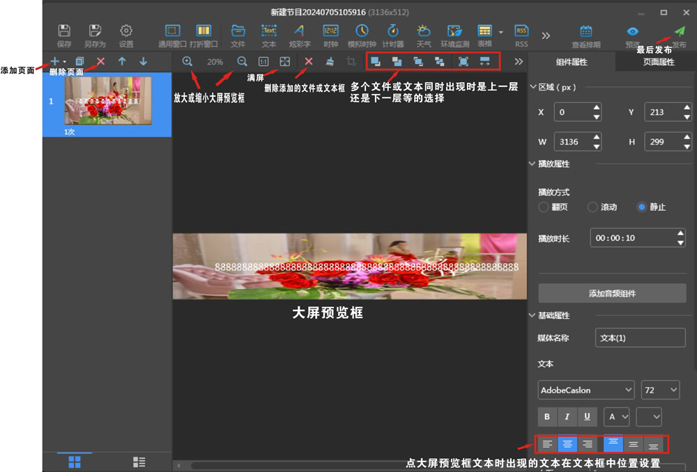 四、編輯節(jié)目:首先在終端管理界面,用鼠標(biāo)點(diǎn)擊終端名稱,再在節(jié)目管理界面,點(diǎn)新建,設(shè)置大屏寬高點(diǎn)數(shù)(不是尺寸),如果先前有節(jié)目,只需勾選后點(diǎn)上面編輯就行。圖片和視頻點(diǎn)擊上面文件,點(diǎn)擊后直接從電腦里選擇文件,文字選擇文本。每一次選擇下面大屏預(yù)覽框上較左上角就有個顯示框,這個顯示框比較小,可以在右上角設(shè)置大小或者用鼠標(biāo)拉大,也可以用鼠標(biāo)拖著擺放在屏的任意位置。文本需要雙擊大屏預(yù)覽左上角文本框后進(jìn)行編輯。不然找不到編輯文字的地方。大屏預(yù)覽框上面有很多設(shè)置功能可以選擇。